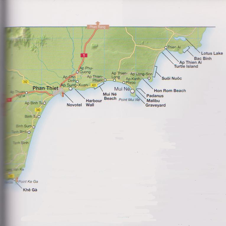 D'après la carte ci-jointe nous étions basés à Graveyard (même configuration que Suoi Nuoc), souvent je traversais la baie profiter d'un vent plus side à Pandanus ou Malibu, et des vagues mieux formées, par défaut réduites en taille. Si je continuais à Hon Rom Beach, le vent devenait perturbé, donc à éviter. Pour être passés devant, à Mui Né Beach = Disneyland la plage est restreinte, le shore break peut être méchant, et le plan d'eau ressemble plus à de la tôle ondulée qu'une peau de bébé. De ce que nous avons à moitié vu et entendu de Novotel, Harbour Wall, Turtle Island (et Ap Thien Ai je suppose), les spots sont barrés par des filets. Reste Lotus Lake, qui marche d'avantage l'été avec de l'ouest par exemple.