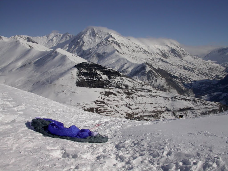 Nous étions partis au début pour initier Sigo à l'ascencion des 3 Evêchés (car vent de SE annoncé), puis au final, comme Olivier s'arrête toujours à Villar d'Arêne pour jeter un oeil... nous sommes allés sur le plateau d'Emparis, qu'il reluque depuis 2 ans et sur lequel une aile tournoyait.